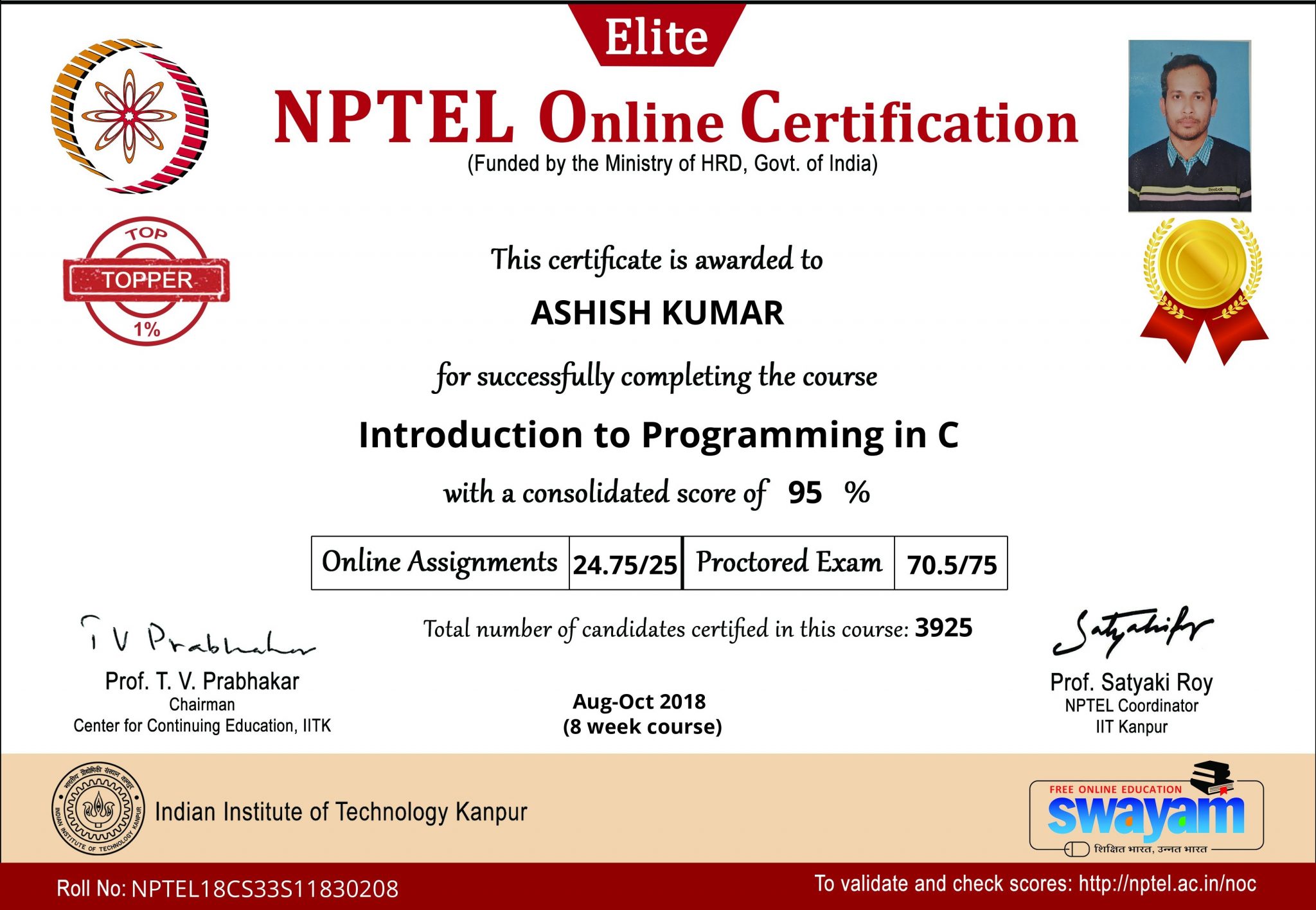 | 1. | Mr. Ashish Kumar | Gold & Topper | NPTEL Online Course-”Introduction to Programming in C” |