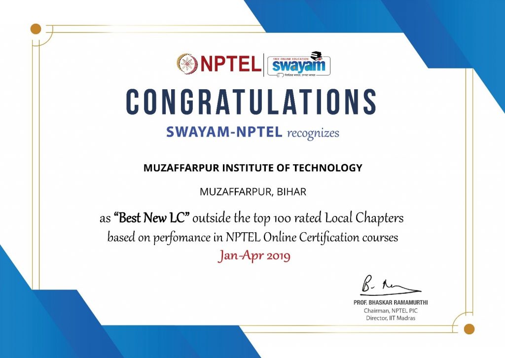 MIT Muzaffarpur became Local Chapter in December 2018. This is the first NPTEL session after becoming LC. Out of 124 candidates, 120 got certified which includes 17 Course Topper, 13 Gold, 22 Silver, 39 Elite and 46 successful completion certificates. MIT Muzaffarpur ranked 105th position in among 788 Active Local Chapters and awarded Best New Active Local Chapter (Certificate)